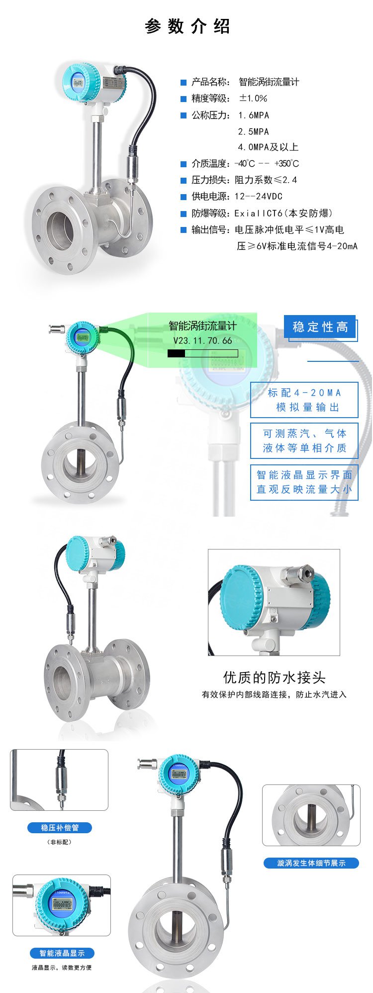 LUGB渦街流量計特點是壓力損失小,量程范圍大,精度高,在測量工況體積流量時幾乎不受流體密度、壓力、溫度、粘度等參數(shù)的影響。無可動機械零件,因此可靠性高,維護量小。儀表參數(shù)能長期穩(wěn)定。渦街流量計采用壓電應(yīng)力式傳感器,可靠性高,可在-20℃~+350℃的工作溫度范圍內(nèi)工作。有模擬標(biāo)準(zhǔn)信號,也有數(shù)字脈沖信號輸出,容易與計算機等數(shù)字系統(tǒng)配套使用,是一款適用的測量儀器。